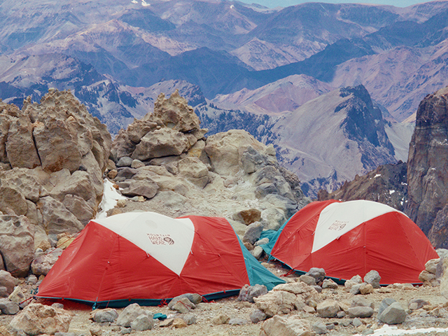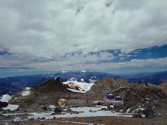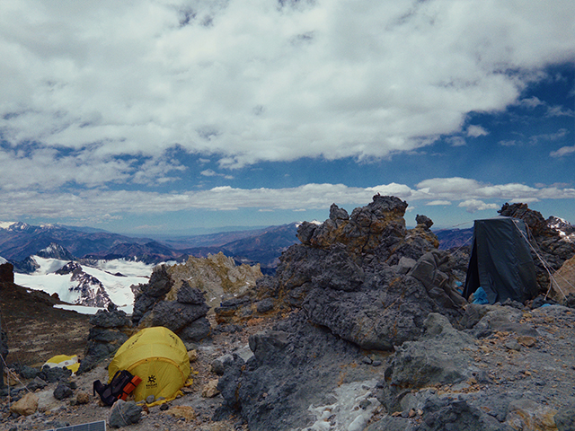 After a night of witnessing a spectacular Andean thunderstorm, we awoke this morning to a beautiful cloak of snow on the ground, ~5cm of white magic. We rustled out of our sleeping bags to a warm breakfast, then prepared our packs to carry a load of supplies to Camp 2. Up up and away, we reached our destination at 18,000', in the early afternoon. We didn't spend long up high -just long enough to cache our supplies - before we flew back downhill to the warmth and comfort of Camp 1. We had a lazy afternoon in the sun filled with eating, sleeping, & hydrating.