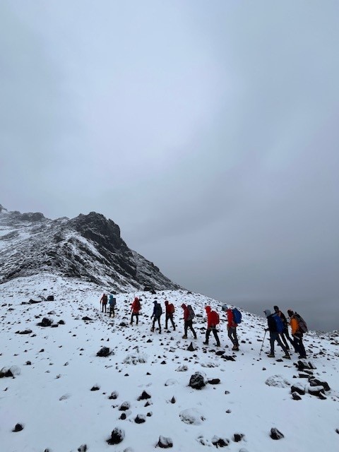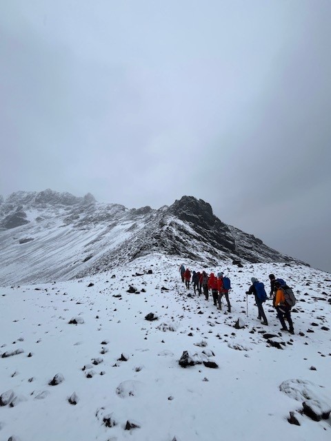 Last night was probably the least comfortable night of the trip. We had strong gusts throughout the night that rattled our tents, and kept us all far from sleep. We spent the morning hiding from the cold and sipping on hot drinks. The winds were too high to make a summit attempt. Eventually things calmed down, and we ventured forth into the world. It has turned into quite a nice day up here, with winds near the summit diminishing as well. We’ve had some amazing views looking down at our previous camps and the
