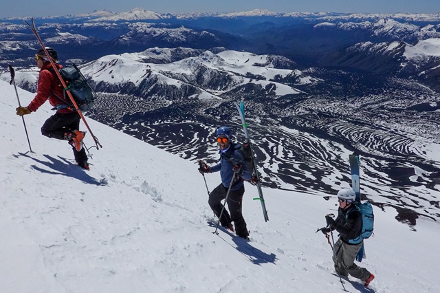 We woke up to the helicopter over our heads, shuttling propane tanks, building materials, and the full toilet cans in and out of camp. A pretty expensive alarm clock! We ate breakfast, and then quickly got ready to depart so that we could minimize the amount of time that we were in the true heat of the day. The group moved really well today, even on the final 600-foot scree slope, where the uphill track disappeared and every step sent you sliding backwards. We left our gear at camp and then turned to descend. The same slope that was so heinous on the way up, had people hooting and yelling as we skied back down. We were back in time for an afternoon siesta, and to feel safe from the rain clouds that had started to build and were threatening. Though we heard some rumbles of thunder this afternoon, the clouds stayed away and we stayed dry. On the schedule for tomorrow is another rest day, one last chance to enjoy the comforts of base camp before we head up to higher elevations.