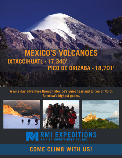 Safety has always been RMI’s top priority and we strive to create the safest mountain experience possible. RMI’s experienced team of guides focus on leading a fun and successful climb without compromising safety. We apply the same standards of safety we bring to Alaska and the Himalayas to our climbs of Mexico’s Volcanoes. Careful planning, precise ascent profiles, daily weather forecasts via satellite, and diligent attention are taken as we venture to high altitudes. Comprehensive medical kits, rescue equipment, and radio and satellite communication equipment are carried with the team throughout the trip.