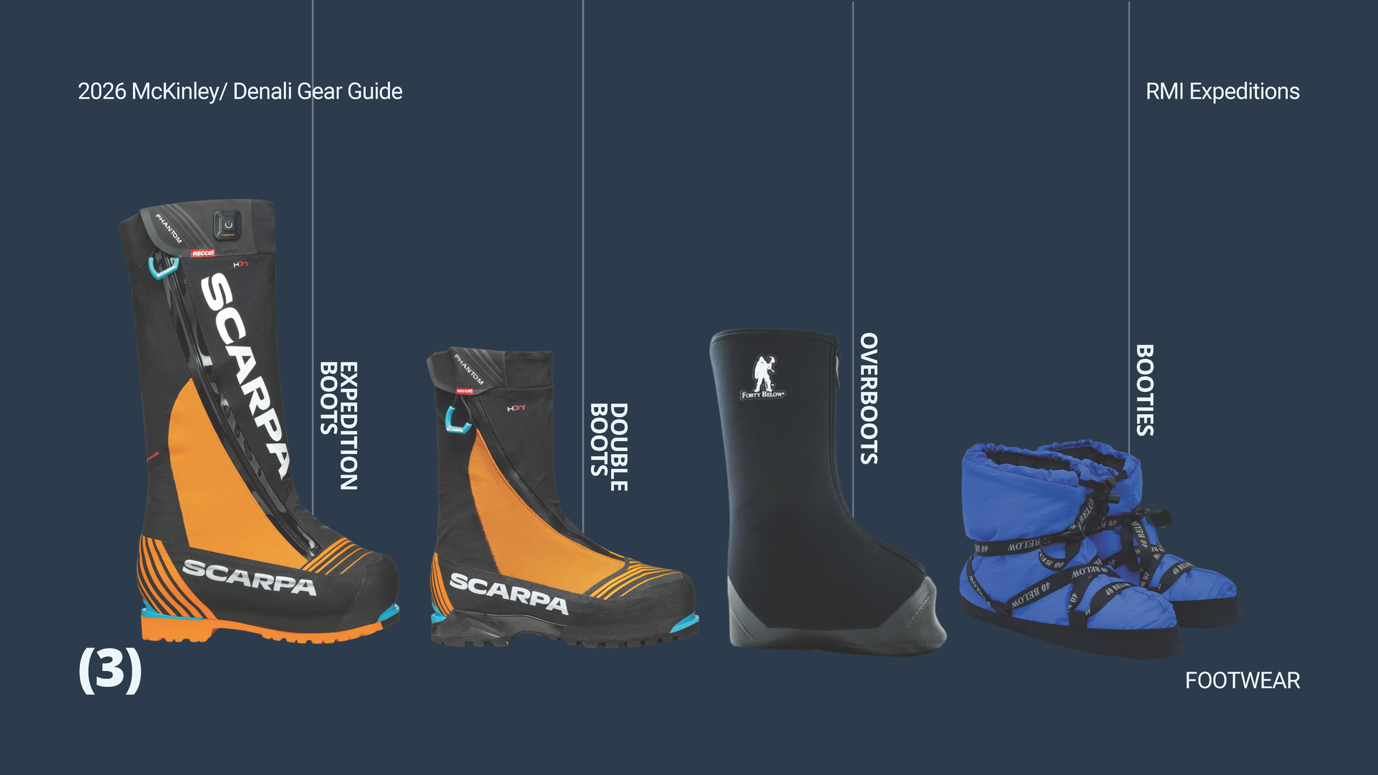 Mountaineering boots are one of the most critical pieces of gear for your McKinley expedition. Proper footwear ensures that your feet stay warm, dry, and comfortable throughout the climb, which is essential for performance and safety. For an in-depth look at mountain footwear, check out the blog over at our retail partner Whittaker Mountaineering.