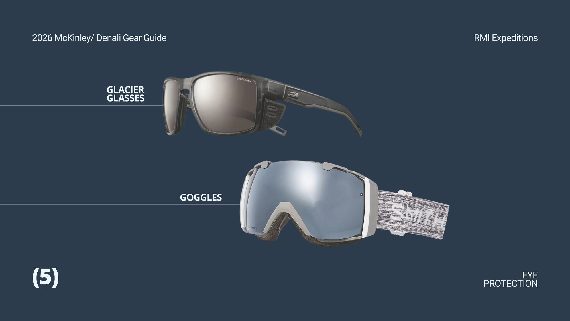 High-altitude climbing on McKinley exposes you to intense UV radiation, making glacier glasses essential. Look for 100% UV protection glasses to shield your eyes from harmful ultraviolet rays. A wraparound design provides maximum coverage and protection from reflective glare, while an anti-fog coating ensures clear vision in varying conditions. Durable frames that can withstand cold temperatures and rough handling are also important. Choose glasses that fit comfortably and stay secure during physical activity, and always carry a spare pair in case of damage or loss. For more info on glacier glasses and goggles, check out the gear post at our retail partner, Whittaker Mountaineering.