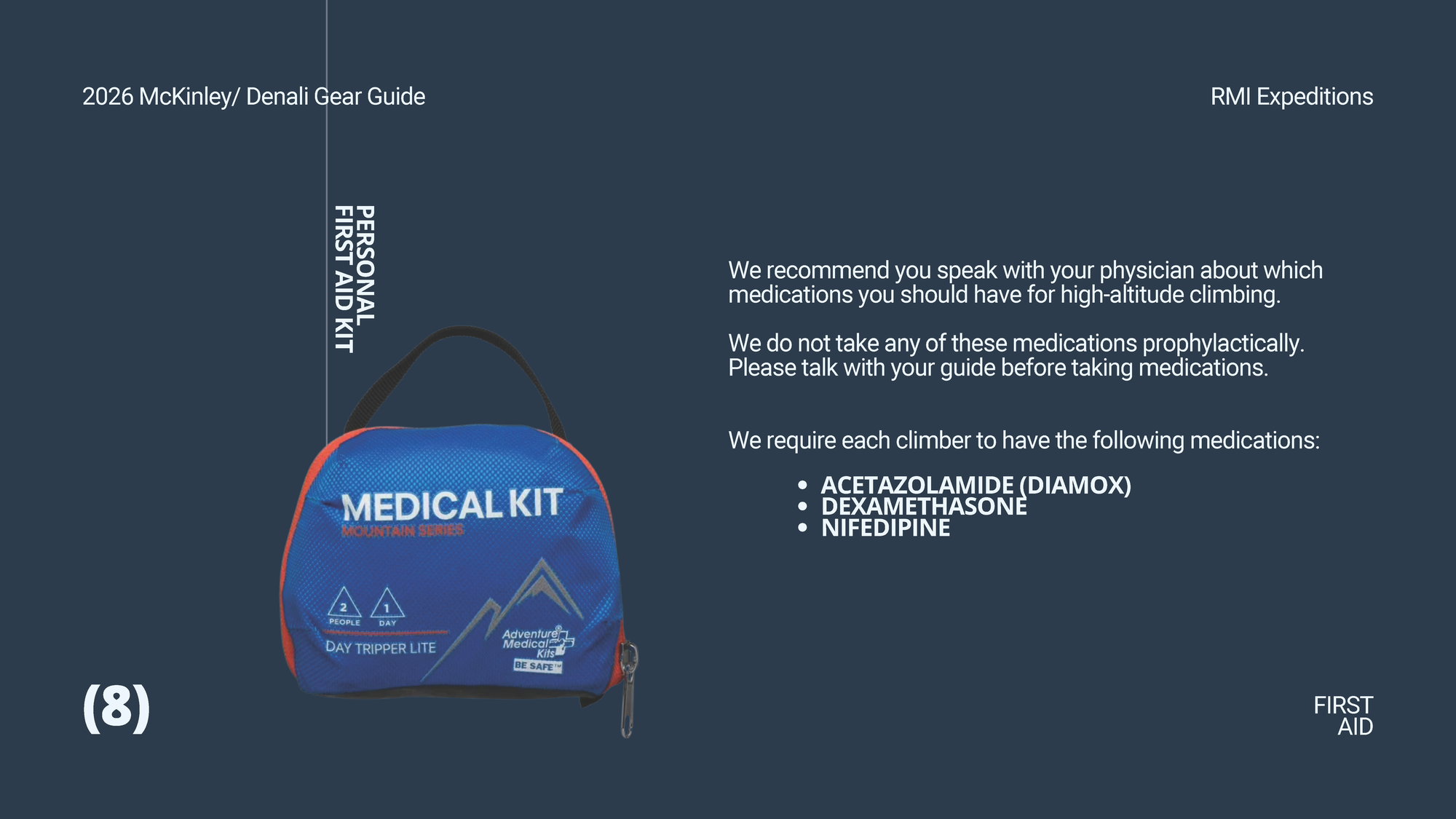 For high-altitude expeditions like McKinley, certain medications are recommended to manage altitude-related issues. Acetazolamide (Diamox) is commonly used to prevent and reduce the symptoms of altitude sickness. Dexamethasone is a steroid that can help in severe cases of altitude sickness, and Nifedipine can be used for high-altitude pulmonary edema (HAPE). Consult with your doctor before the expedition to understand how and when to use these medications, and ensure you bring enough for the duration of your trip.