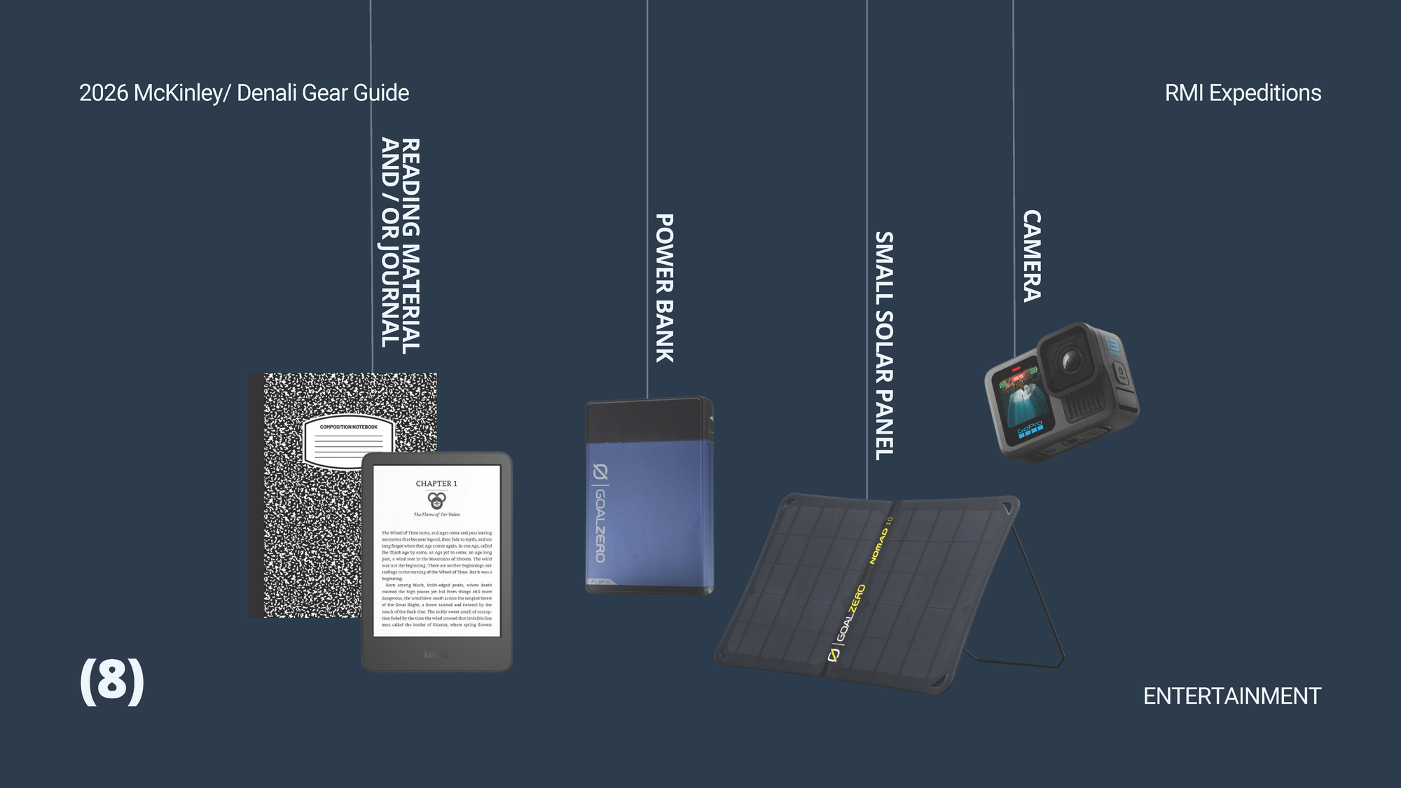 Downtime in tents is inevitable on a McKinley expedition, especially during weather delays. Bring lightweight, engaging reading material to pass the time and keep your mind occupied - we all want to go old-school in nature, but a Kindle or other E-Reader really does save a lot of weight. A journal is also a great way to document your thoughts, experiences, and observations. Writing in a journal can be a reflective and rewarding activity, helping you process your journey and create a personal record of your adventure.